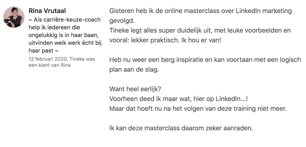 Eerder had iemand me al de tip gegeven het toch te gaan doen en vervolgens zag ik dat Tineke een Masterclass organiseerde. Dus ik dacht ‘als je het dan toch gaat doen, leer dan in ieder geval hoe je het het beste kan doen’. En daarvoor zit je bij Tineke goed; ze weet veel van online marketing en doet het erg goed op LinkedIn.